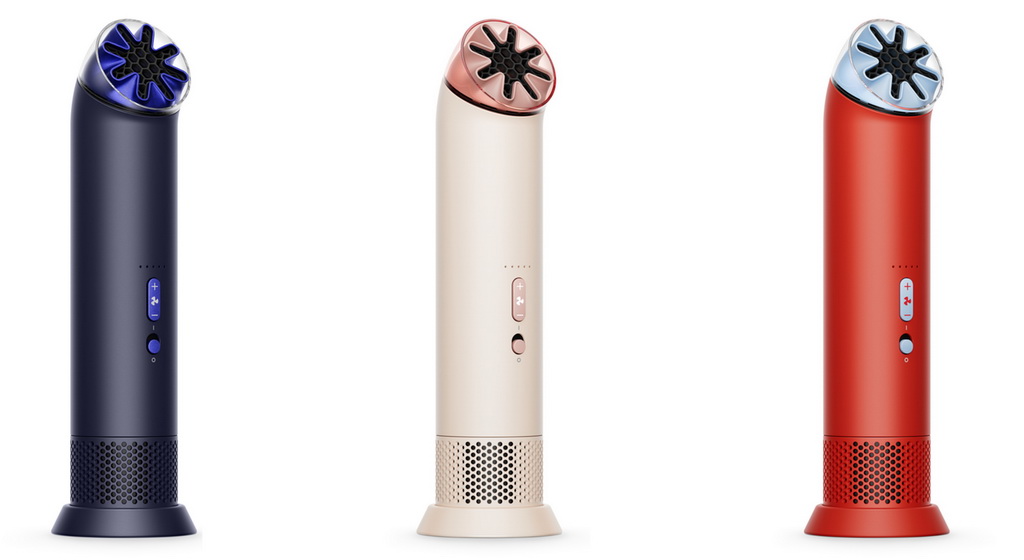 El HushJet Mini Cool llega en tres combinaciones de color, diseñadas por Holly Holmes: azul cobalto combinado con azul marino; Carnelian / Sky, una evolución del clásico rojo Dyson en acabado mate, contrastado con azul cielo para reforzar la sensación de frescura; y Stone / Blush, blanco suave con matiz rosado, inspirado en el nácar.