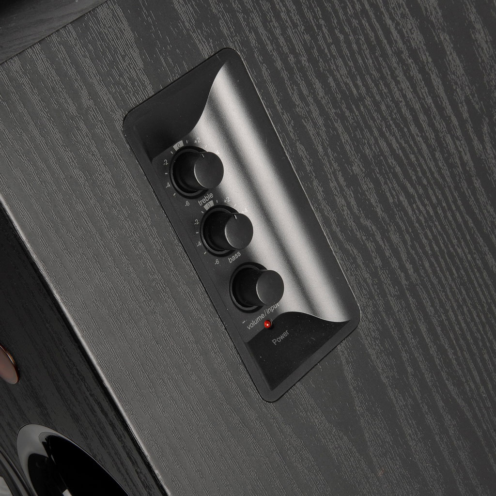 Otros datos son su soporte Bluetooth 5.1 con soporte aptX para una efectiva conexión de los altavoces con los dispositivos iOS, Android, Mac o Windows, y un manejo ultra sencillo, que se resume en unos mandos en el lateral para ajustar el volumen, los timbres de agudos y graves, y las fuentes de señal. Entremos en detalles.
