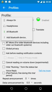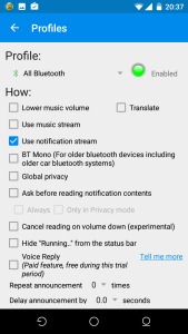 Además de leer las notificaciones de Whatsapp, la app ReadItToMe también es capaz de dictarte mensajes SMS, Hangouts de Google, mensajes de Telegram, Chats de Facebook o incluso emails. También es posible responder vía voz a cualquiera de estas notificaciones. Estas dos funcionalidades están disponibles sólo en la versión de pago (2,5 €), aunque tienes una prueba de dos semanas gratis para probarlas. Además, se puede escoger las notificaciones que se leen, cuándo te las leen, si sólo quieres que se te lea el título, la notificación entera, bloquear o permitir notificaciones de voz sólo de determinados contactos o discriminar entre las aplicaciones cuyas notificaciones queremos escuchar. También se puede optar por escucharlas en todo caso, sólo cuando llevemos auriculares, o cuando tengamos el teléfono emparejado con un dispositivo bluetooth como auriculares o altavoces.