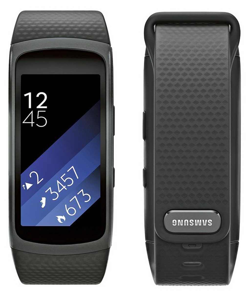 En cuanto a la nueva versión del Gear Fit, destaca especialmente por su pantalla ultrapanorámica, AMOLED y de 1,5 pulgadas, lo que le hace mucho más ancho que su predecesor. Incluyen el pulsómetro para controlar el ritmo cardiaco en todo momento, además del chip GPS para medir parámetros como distancia recorrida sin dependencia del emparejamiento con un smartphone. Por supuesto, también permite la recepción de llamadas y notificaciones, además de responder en ambos casos. Una de las grandes novedades es la llegada de Auto Activity, por la cual ni siquiera tendremos que indicar a la pulsera que vamos a empezar a entrenar. El propio dispositivo usa sus diferentes sensores para detectar que estamos empezando a practicar cualquier actividad, y se activa automáticamente. Además, permite reproducción de música (mediante auriculares bluetooth), con una capacidad de almacanamiento de 4 GB que se puede sincronizar con la música almacenada en Spotify, En cuanto a autonomía, según la versión de Samsung, puede llegar a tres o cuatro días sin problemas con un uso moderado, y a cinco si el dispositivo permanece en standby. Además, posee resistencia a agua y polvo, con certificación IP68. Es compatible con teléfonos Android con versión 4.4 o superior y, como mínimo, 1,5 GB de RAM. Su precio internacional es de 179 dólares.
